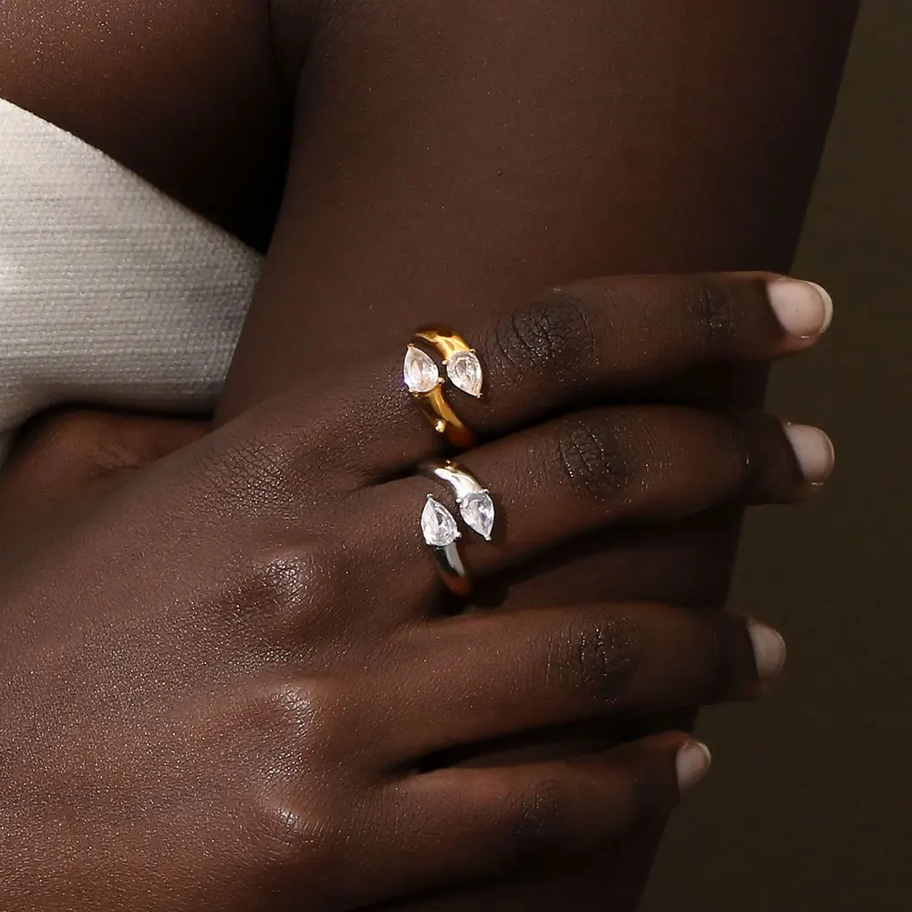 Discover the perfect blend of sophistication and minimalism with this stunning 18K gold-plated double-headed waterdrop zircon ring. Designed for women who appreciate timeless elegance with a contemporary twist, this ring is the ideal accessory for any occasion. The gleaming zircon stones and sleek waterdrop shape create a look that is both delicate and eye-catching. Crafted from tarnish-free 316L stainless steel, this ring promises durability and comfort without compromising on style.