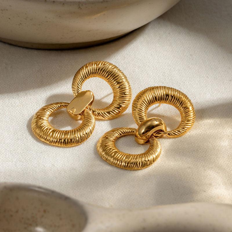 These earrings are more than just an accessory—they’re a statement piece that complements any style. The 18K Gold Plated Stainless Steel Double Loop Texture Pendant Earrings are perfect for special occasions like weddings, anniversaries, or parties. Their vintage-inspired design pairs beautifully with formal dresses and adds a touch of elegance to your everyday wear.