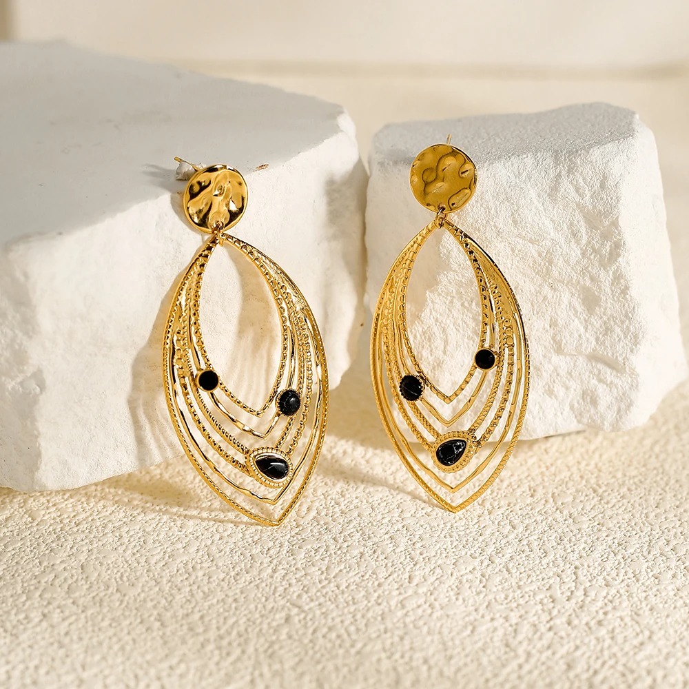 Elevate your style effortlessly with these 18K Gold Plated Stainless Steel Drop Earrings. Perfectly blending geometric elegance with natural beauty, they’re a must-have for anyone who appreciates high-quality, versatile accessories. Add them to your collection today and experience the ultimate in trendy, sophisticated jewelry.