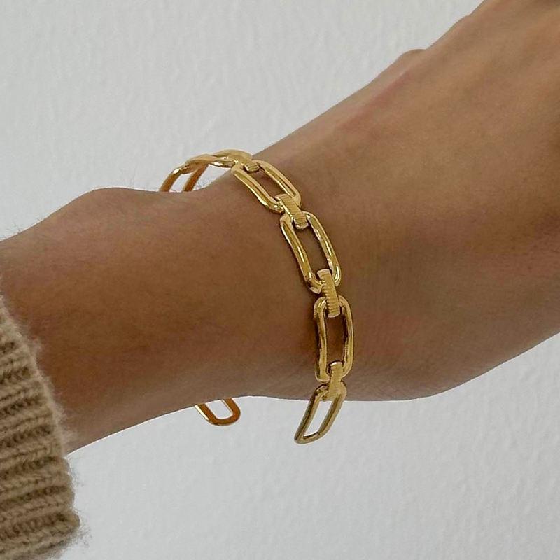 Crafted from high-quality stainless steel, this bracelet not only exudes elegance but also offers durability for long-lasting wear. The 18K gold plating gives it a luxurious golden sheen, adding a layer of sophistication. With no high-concerned chemicals, you can enjoy a worry-free fashion experience. Designed with an open cuff style, it comfortably fits most wrist sizes, while the geometric loop-shaped pattern adds a trendy, vintage touch.