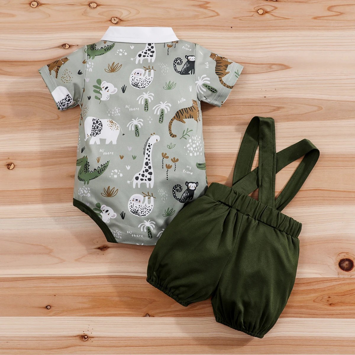 - Includes 1 short-sleeve bodysuit and 1 pair of suspenders pants