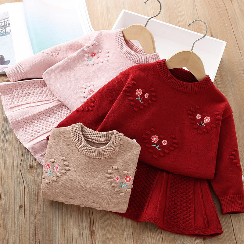 Charming Autumn Style for Little Girls: Embroidered Flower Sweater & Skirt Set