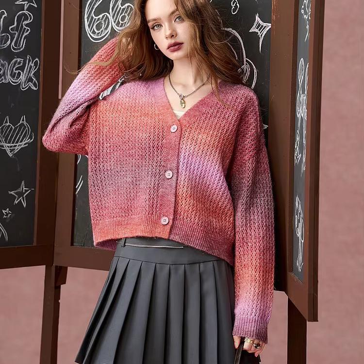 Don’t miss out on this sweet and versatile autumn essential. The cozy blend of materials, trendy gradient design, and flattering V-neck make this cardigan sweater a must-have for the season. Add it to your wardrobe now and enjoy the perfect mix of warmth, comfort, and style all autumn and winter long!