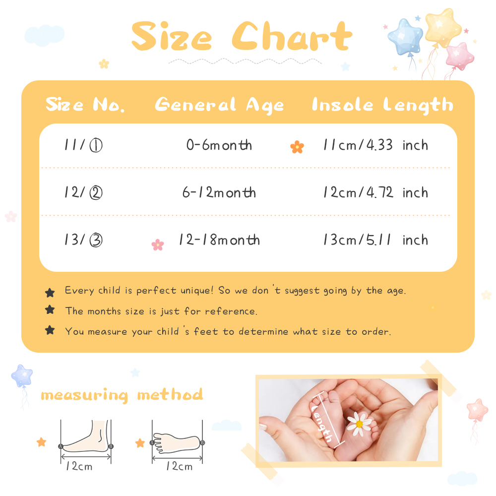 - 7-12 months: 4.72″ sole length / 2.28″ width