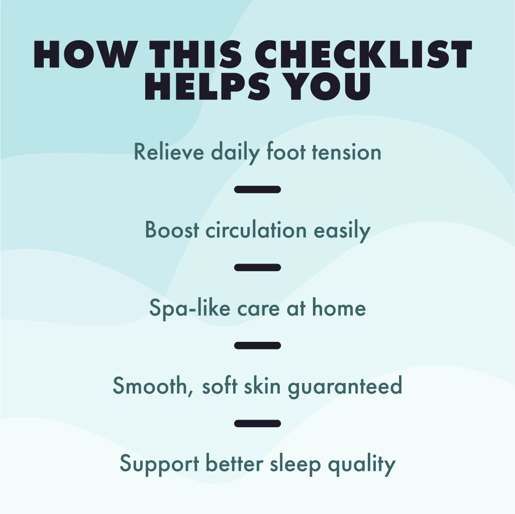 This checklist is made for anyone who wants to embrace self-care, improve circulation, and enjoy the simple joy of foot relaxation. It’s especially helpful for teachers, nurses, retail workers, fitness enthusiasts, or anyone on their feet all day.