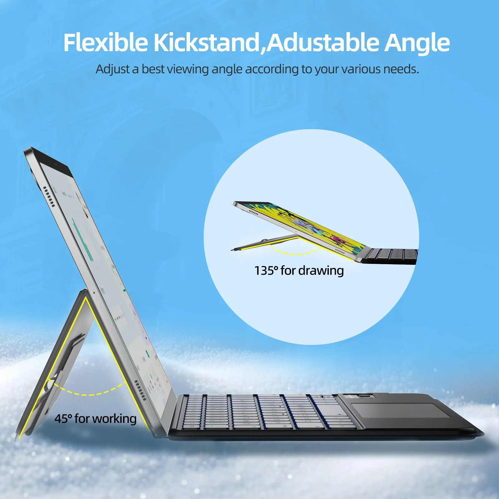 From early morning meetings to late-night studying, the adjustable backlight ensures you can type comfortably in any lighting. The Bluetooth connection is quick and reliable, and the case folds into multiple viewing angles for typing, browsing, or binge-watching.