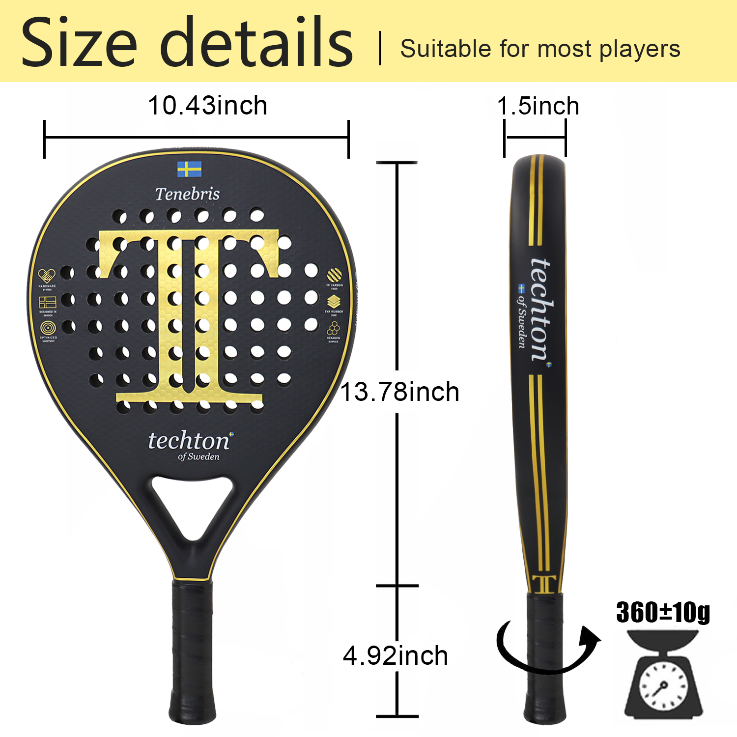 Measuring 18.1 inches in length and 1.5 inches thick, and weighing approximately 12.7 oz, it fits comfortably in your hand while providing a solid, responsive feel. The unique round shape promotes a larger sweet spot, making it a reliable choice for beginners and seasoned players alike. The embroidered logo strap adds a premium touch, while the included cover bag keeps your paddle protected and match-ready.