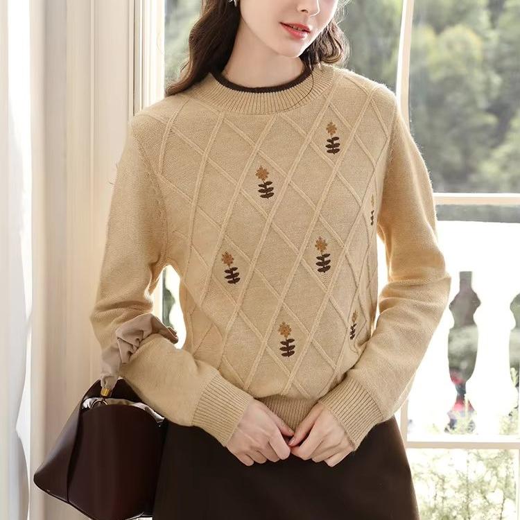 Embrace the perfect blend of comfort and chic style with our Cozy Khaki Embroidered Crew Neck Knit Sweater. Designed for the modern woman, this sweater is an absolute must-have for your autumn and winter wardrobe. Featuring an intricate argyle embroidery pattern, this long-sleeved sweater provides a timeless look that’s ideal for both casual days and professional settings. Made from a premium blend of polyester, acrylic, and polyamide, this sweater offers a soft feel against your skin while ensuring durability for everyday wear.