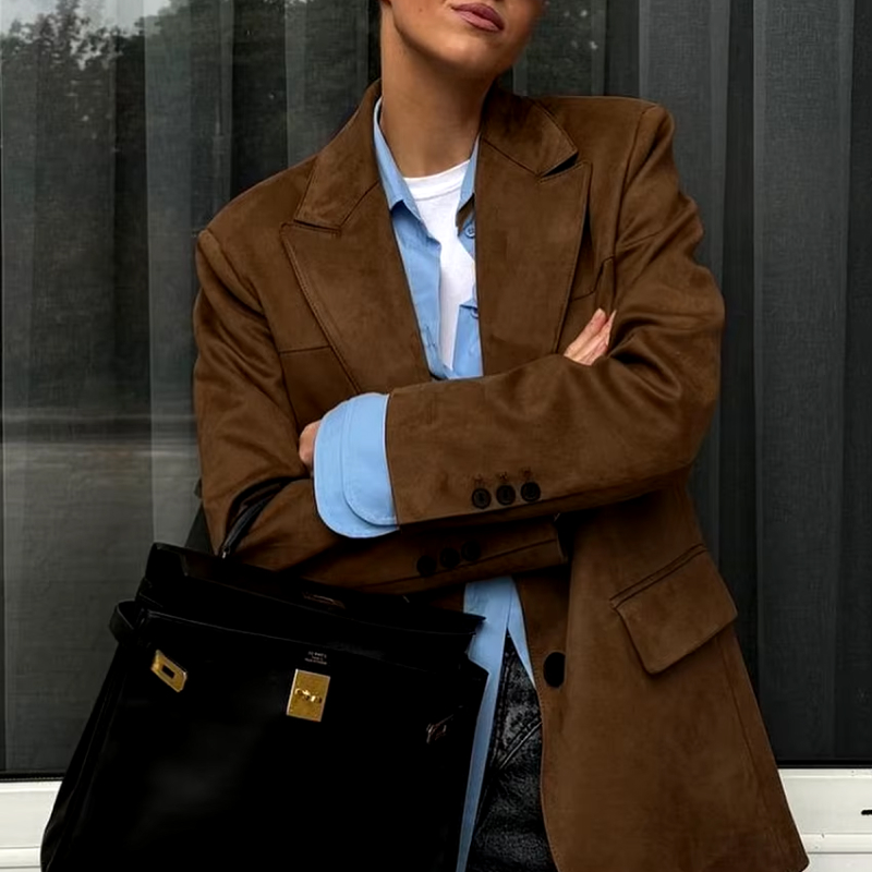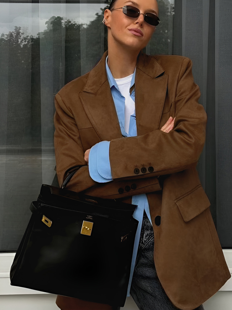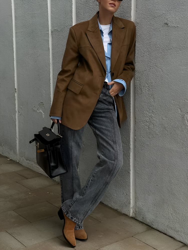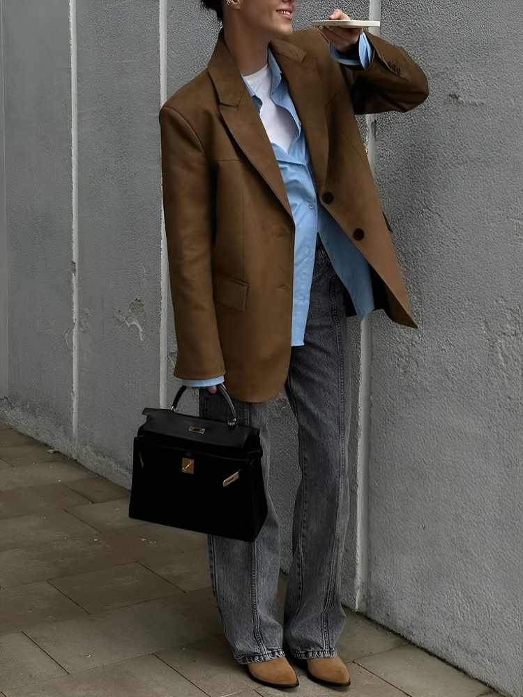 This versatile blazer is perfect for a variety of occasions. Its polished design makes it an excellent choice for the office, offering a professional yet stylish appearance. The loose, comfortable fit also makes it ideal for casual outings, from lunch dates to weekend get-togethers. Wear it over a blouse or shirt for a refined look, or pair it with a dress to elevate your style for an evening event. This brown blazer is suitable for all seasons, providing just the right amount of warmth during cooler months without being too heavy.