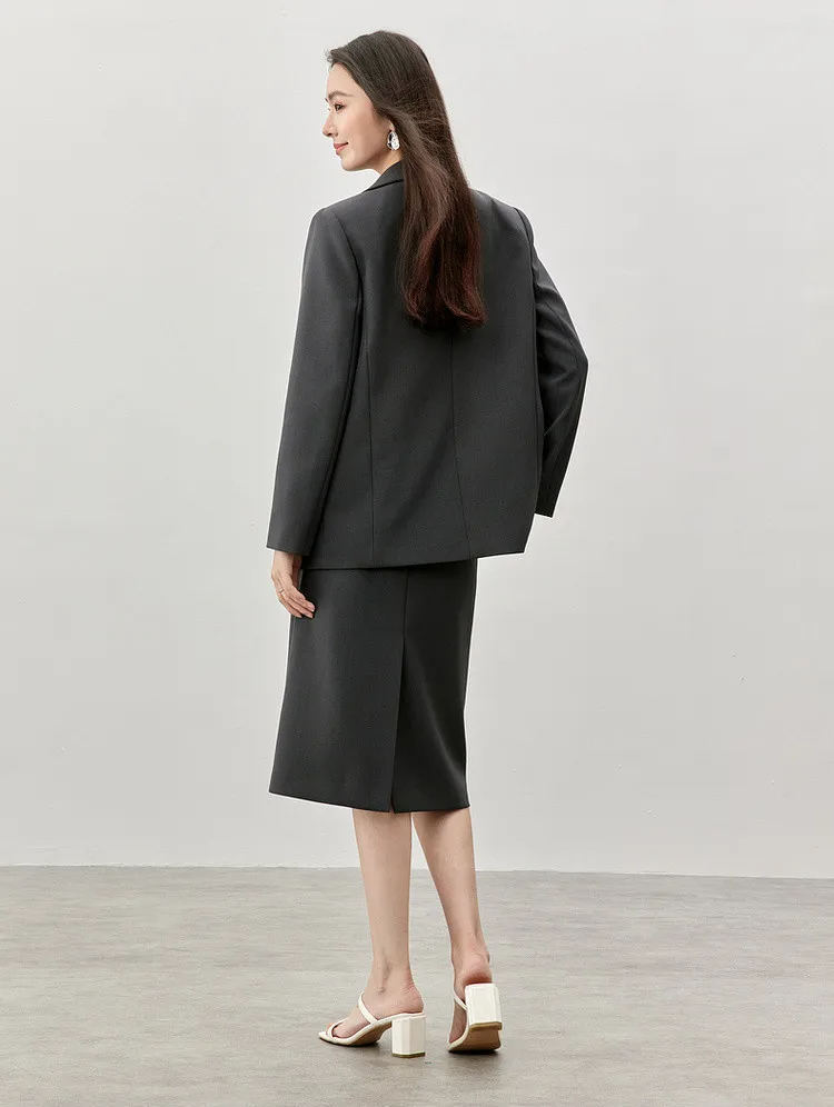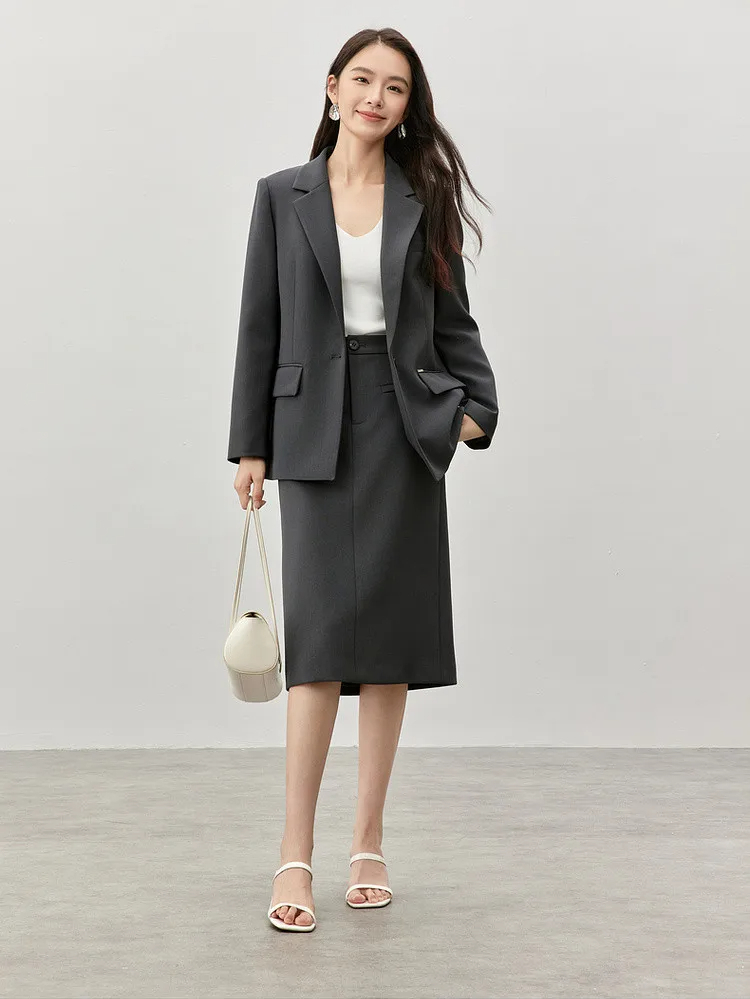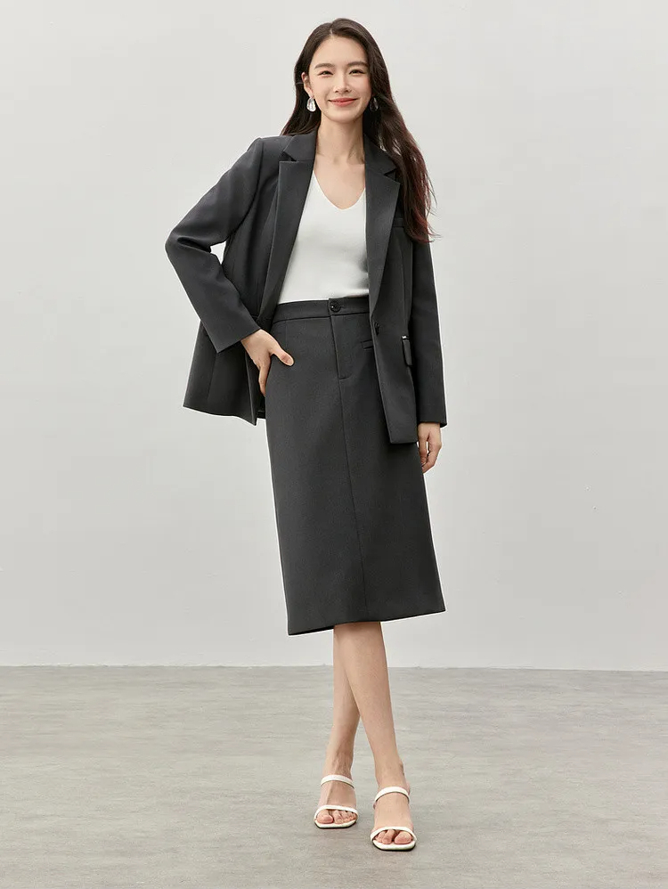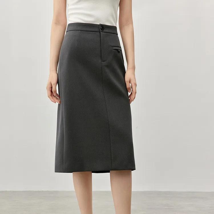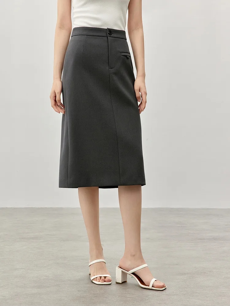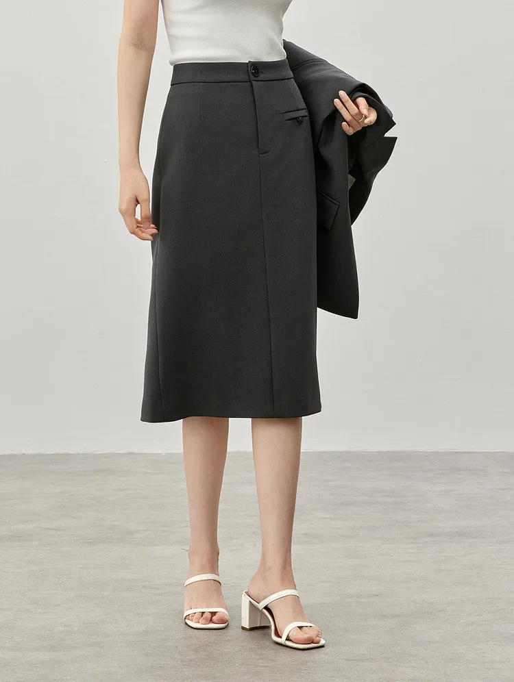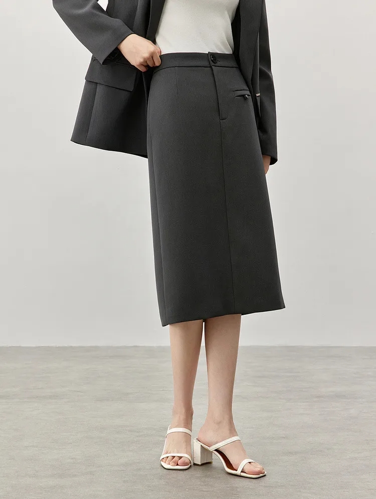 Step into sophistication with our timeless knee-length straight skirt, designed to elevate your winter wardrobe. Crafted from premium twill fabric, this skirt seamlessly blends style and comfort, making it an essential addition to your professional attire. Its sleek silhouette and slit hem exude a refined charm, perfect for creating a polished look that commands attention in any setting.