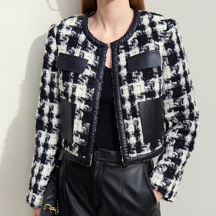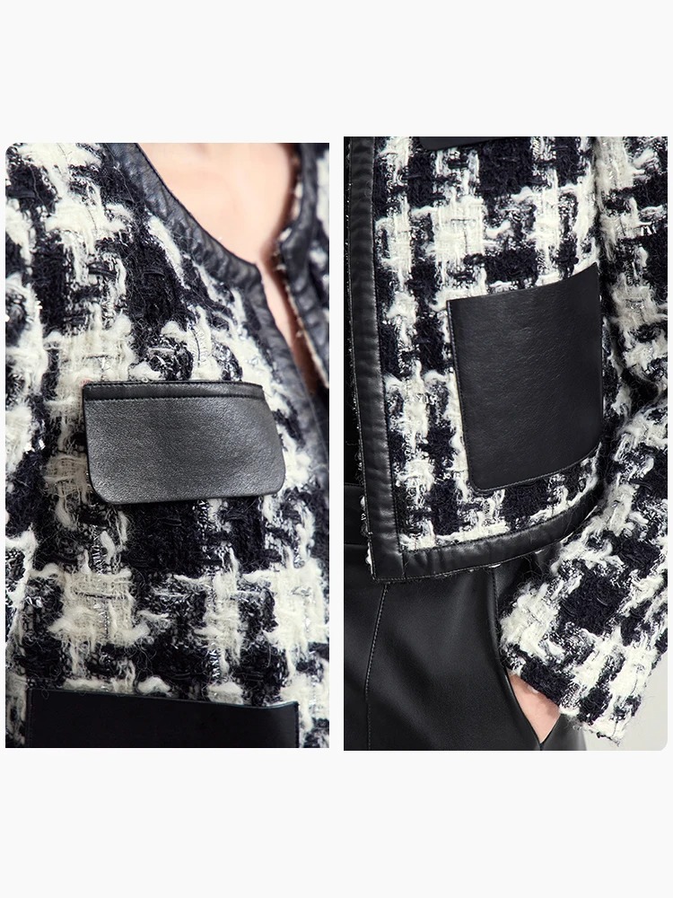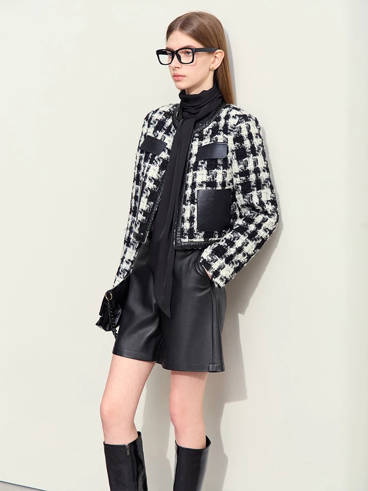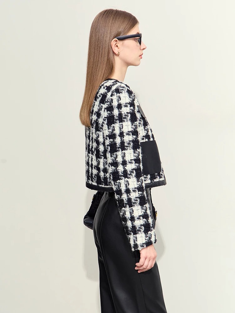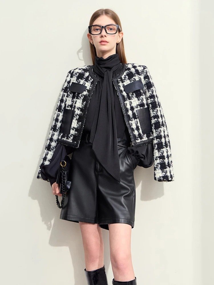 This short winter coat combines functionality with effortless style, offering a flattering wide-waisted silhouette and eye-catching plaid pattern. Its O-neck collar and spliced PU leather detailing add a unique twist to a classic design. The covered button closure ensures a sleek and polished look, while the full-length sleeves provide optimal coverage for chilly days.