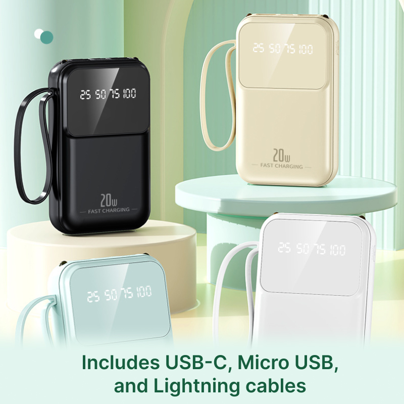 - Built-In Cables: Includes USB-C, Micro USB, and Lightning cables for versatile charging options.