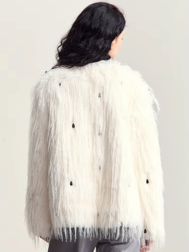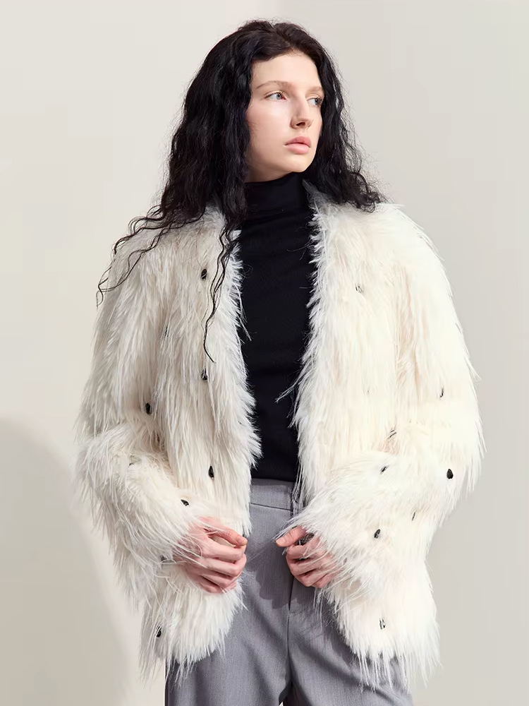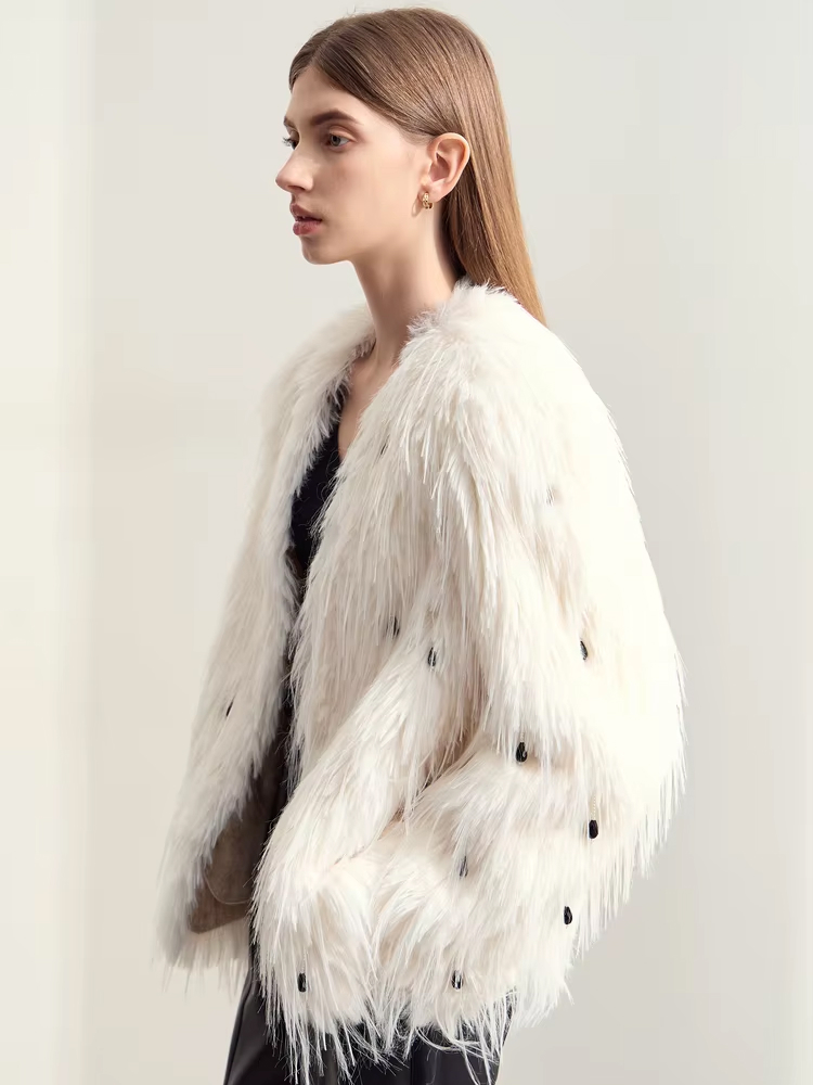 What makes this faux fur coat special is its perfect fusion of classic luxury and modern minimalism. The beautiful V-neck design is not just stylish—it’s also practical, giving you the versatility to layer with your favorite winter outfits. The nail bead embellishment creates just the right amount of sparkle, making it perfect for evening events or adding a bit of flair to your everyday wear.