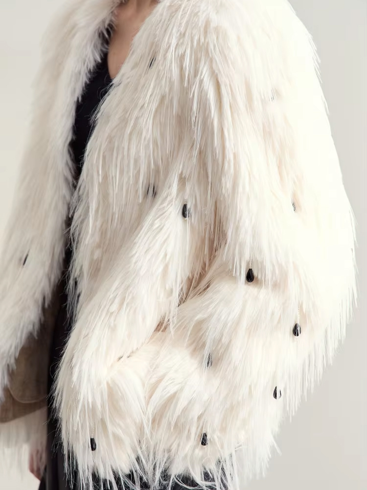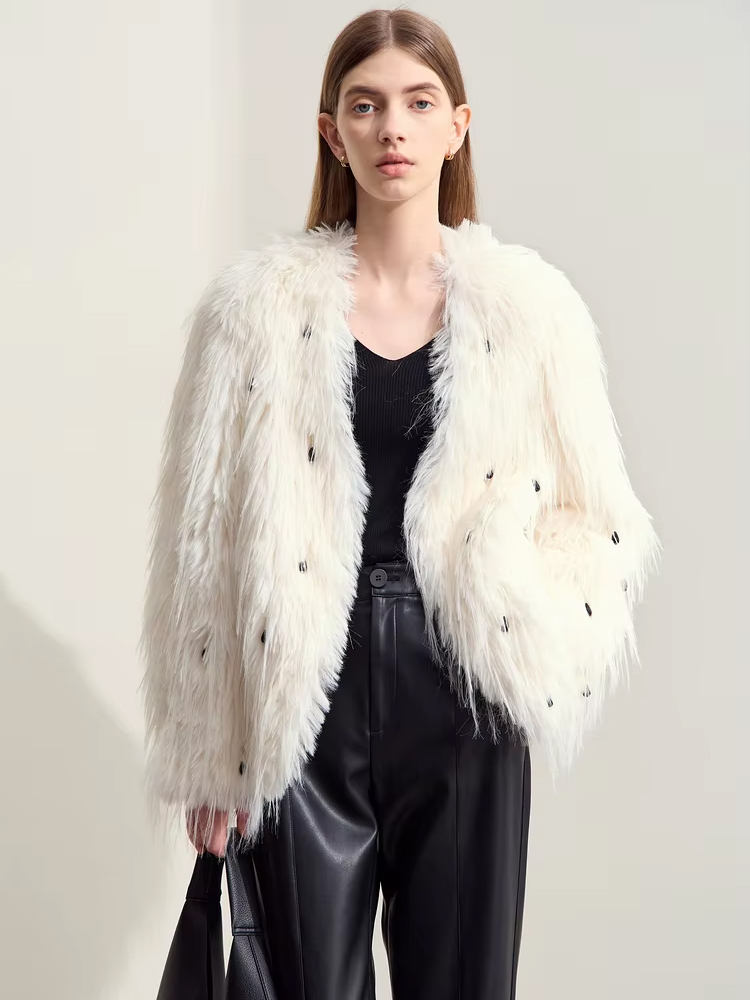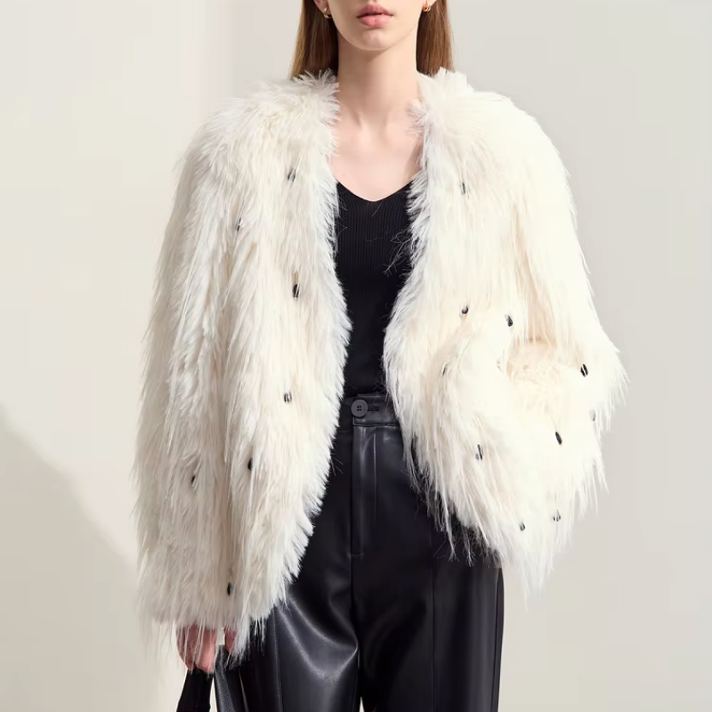 Step into winter with timeless elegance in this stunning faux fur outerwear, designed for women who love luxury with a touch of modern flair. This V-neck fur coat features intricate nail bead detailing that catches the light, adding an elevated dimension to your winter wardrobe. Made from soft, double-faced synthetic fiber, it offers a plush feel that not only looks opulent but also keeps you warm during the colder months. Whether you’re heading out for a casual day or attending a special event, this coat offers the perfect balance of sophistication and comfort.