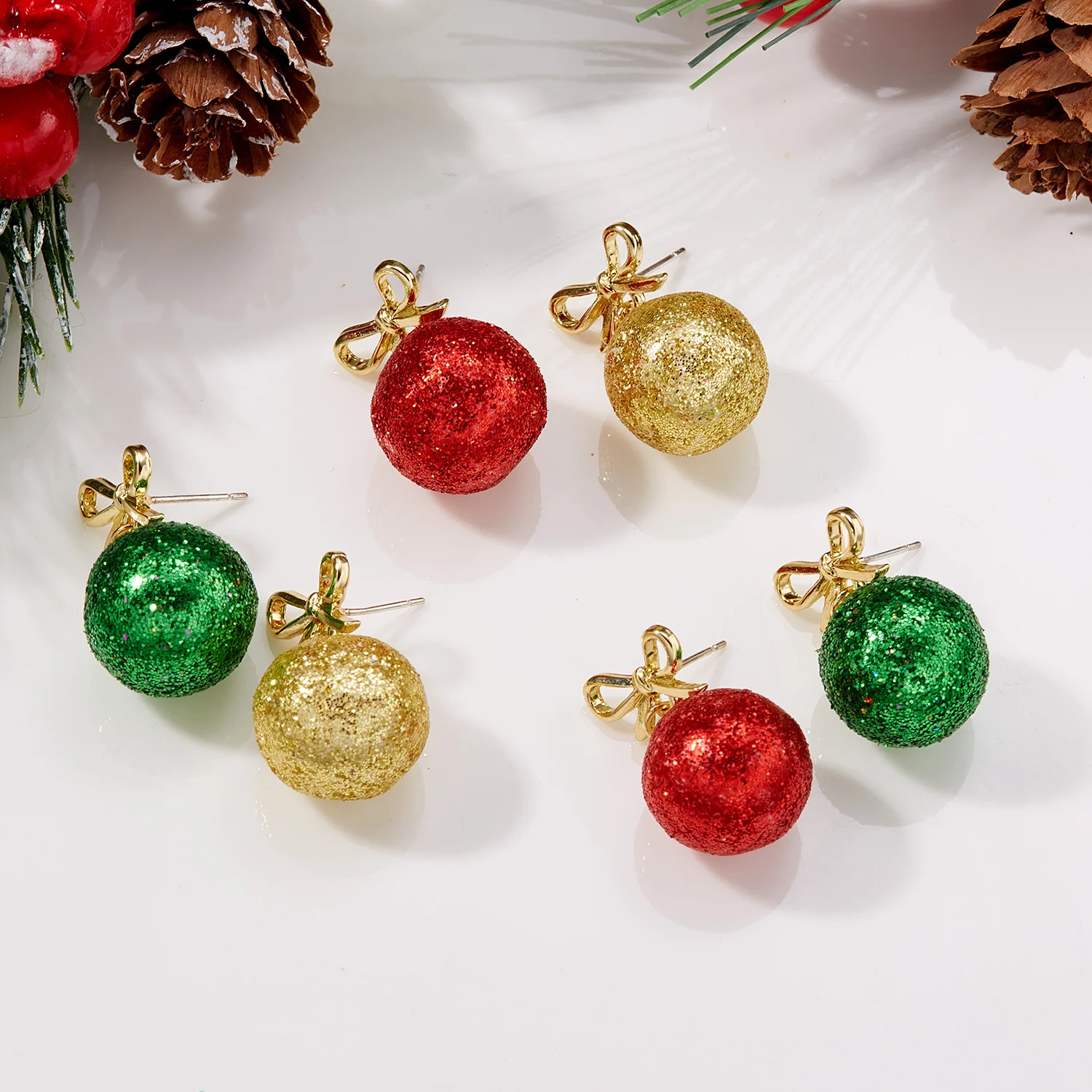 Festive Green and Red Ball Earrings with Snowflakes for Women
