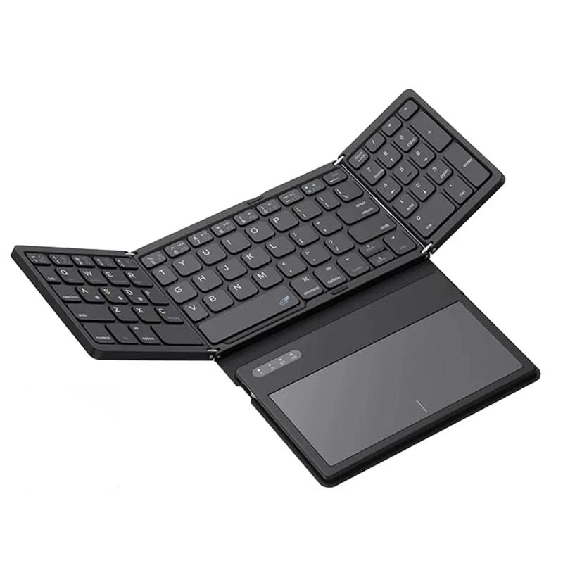This foldable Bluetooth keyboard is perfect for travelers, remote workers, and anyone looking to maximize productivity on their mobile devices. Its unique design combines portability, versatility, and functionality. Switch effortlessly between devices with the press of a button, and work comfortably with 81 keys that provide a tactile, responsive typing experience. The touchpad adds extra convenience, making it a complete solution for mobile computing.