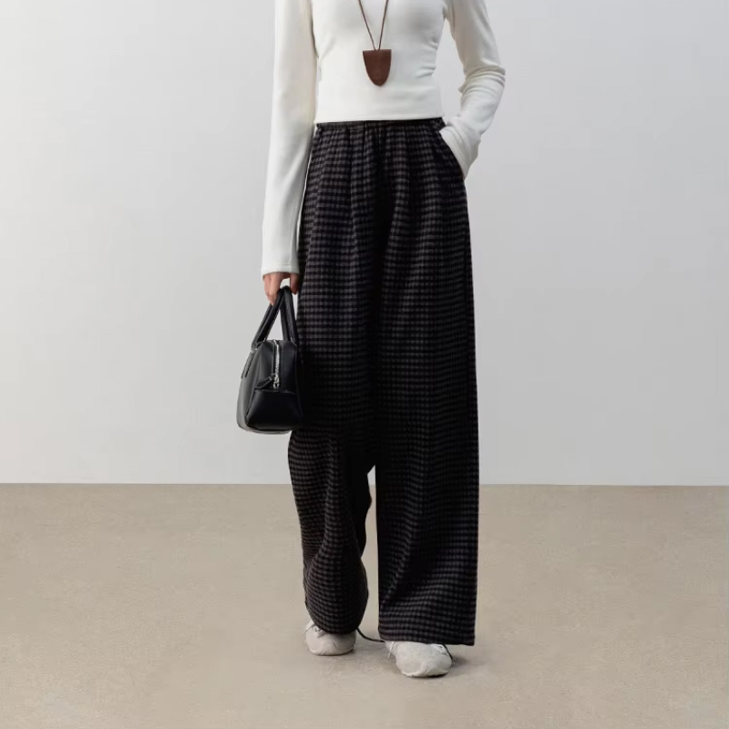 These plaid pants are designed to bring together comfort, warmth, and style. The woolen fabric provides insulation against the chill of autumn and winter, while the loose, wide-leg cut ensures that you can move freely and comfortably throughout your day. The high waist design elongates the legs, creating a flattering shape, while the elastic waistband adds flexibility, making it easy to slip in and out of these pants with ease.