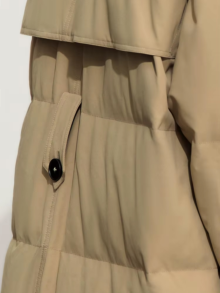The long, full-coverage design is perfect for layering over your favorite sweaters, dresses, or casual outfits. The wide-waisted style is flattering on any body shape, offering a comfortable fit that allows you to move freely while staying stylish. With an adjustable belt and single-breasted button closure, this jacket can be customized to your preferred look, adding an elegant finishing touch to your winter wardrobe.