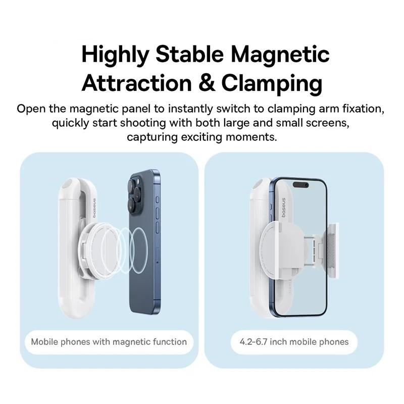 The 12N magnetic strength offers quick attachment to your phone, while the clamping feature ensures extra stability. It supports mobile phones ranging from 4.2 to 6.7 inches, making it compatible with most devices. The detachable Bluetooth remote is a game-changer for solo creators—take photos or videos with a single click from up to 33 feet away.