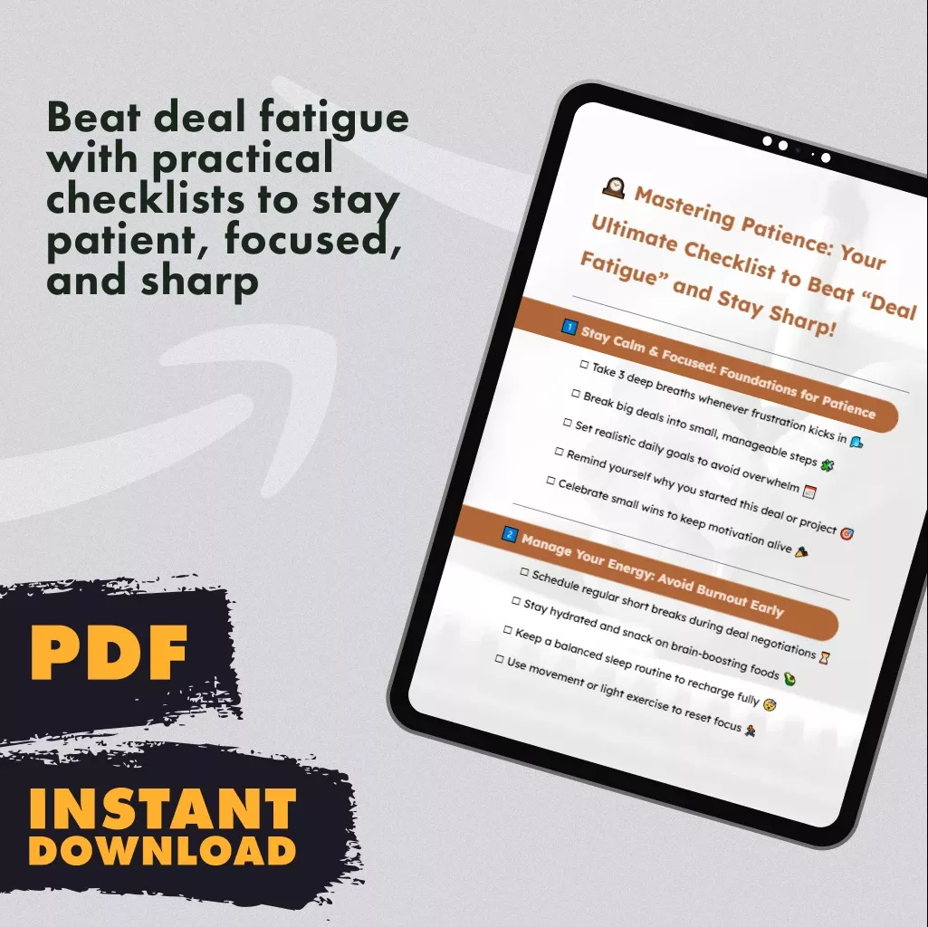 Don’t let deal fatigue slow you down. Download Mastering Patience: Your Ultimate Checklist to Beat “Deal Fatigue” and Stay Sharp now and equip yourself with proven strategies to stay focused, confident, and ready to win—no matter how long the deal takes.