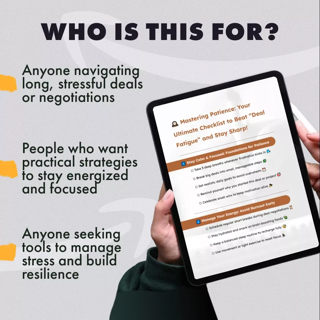 This digital download is for entrepreneurs, business owners, freelancers, and professionals who want to sharpen their patience, avoid burnout, and stay resilient during long negotiations or complex projects. If you’ve ever asked yourself how to stay patient and avoid “deal fatigue,” this is the checklist you’ve been waiting for.