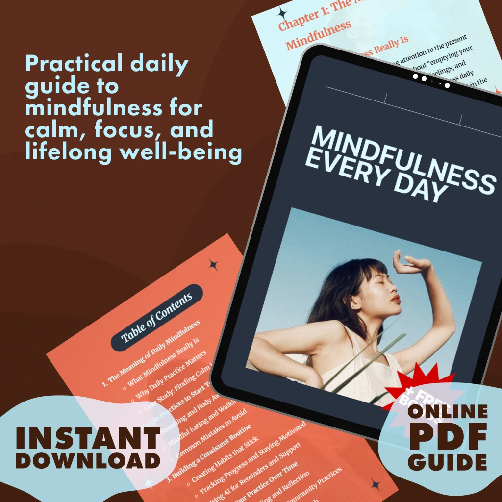 Discover how to practice mindfulness daily with this beautifully designed digital guide, Mindfulness Every Day. Whether you’re new to mindfulness or looking to deepen your current practice, this resource provides clear, simple, and practical steps to bring calm, focus, and presence into your life. More than just a guide, it’s a complete toolkit that helps you build habits that last, avoid common mistakes, and stay motivated over time.
