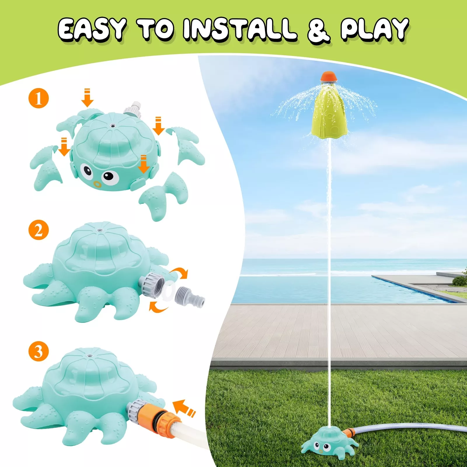This outdoor sprinkler isn’t just a toy—it’s a mini water park right at home. Shaped like a colorful octopus rocket, it features smooth, child-safe edges and durable ABS plastic construction. Its 360° spinning action creates a dynamic water spray, reaching up to 6.5 feet high depending on your water pressure. Installation is a breeze with just three quick steps—attach the legs, connect the hose, and twist on the sprinkler. The built-in sealing ring prevents water leaks, ensuring powerful sprays and less mess.