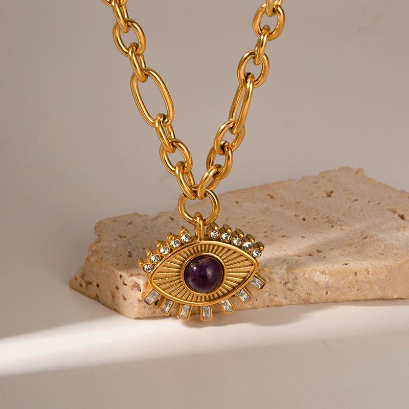 Enhance your style and protect your energy with this stunning Stainless Steel Evil Eye Talisman Necklace. Designed with a semi-precious Amethyst cabochon at its center, this handcrafted piece combines elegance with a powerful symbol of protection. The evil eye charm is known for warding off negative energies, making this necklace more than just a fashionable accessory—it’s a talisman to keep you grounded and safe.