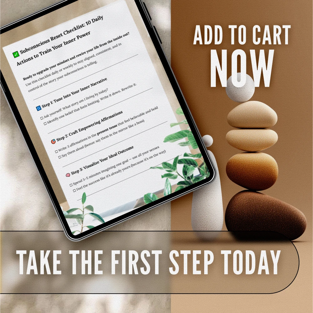 Ready to ditch limiting beliefs and step into your most empowered self? The Subconscious Reset Checklist: 10 Daily Actions to Train Your Inner Power is your go-to digital guide for rewiring your mindset, boosting inner clarity, and unlocking unshakable confidence. Designed to fit into your daily routine, this easy-to-follow checklist combines proven subconscious mind exercises with practical, soulful actions. Whether you’re just beginning your mindset journey or looking to deepen your practice, this checklist will help you reset your inner narrative and start attracting aligned success — starting today.