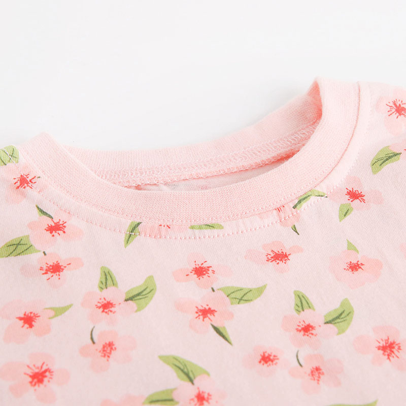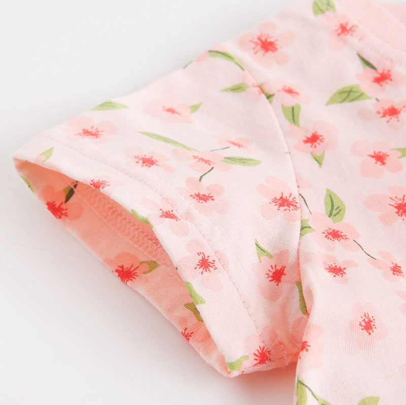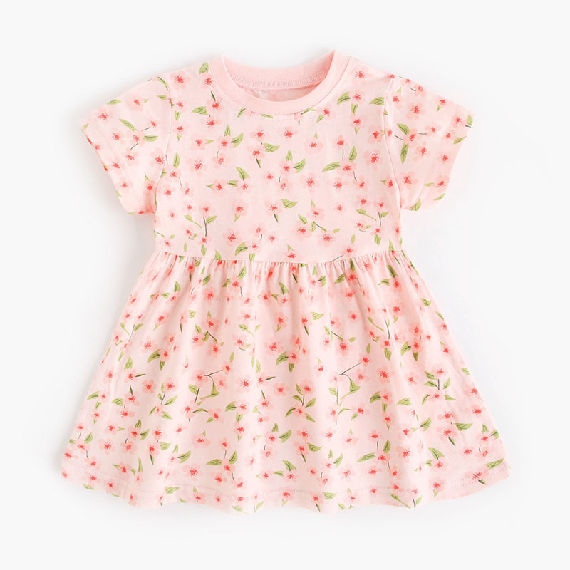 Let your child bloom this summer with this charming pink floral dress, designed to capture the sweetness of childhood. Featuring a delicate print of tiny pink flowers and green leaves on a light pink background, this dress is the perfect blend of cuteness and comfort. With its breezy short sleeves, soft cotton fabric, and playful A-line silhouette, this dress is an easy favorite for sunny days and special moments.