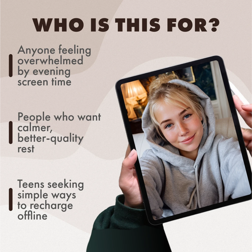 Unlike generic sleep tips or broad wellness ebooks, Teen Calm: Your Offline Evening Reset is written specifically with teens in mind. It addresses real struggles like social media, multitasking, and pressure-filled days, while offering a supportive, encouraging voice. By integrating mindfulness, relaxation activities, and smart technology use, the Teen Calm: Offline Evening Guide empowers teens to reset their evenings with confidence and ease.