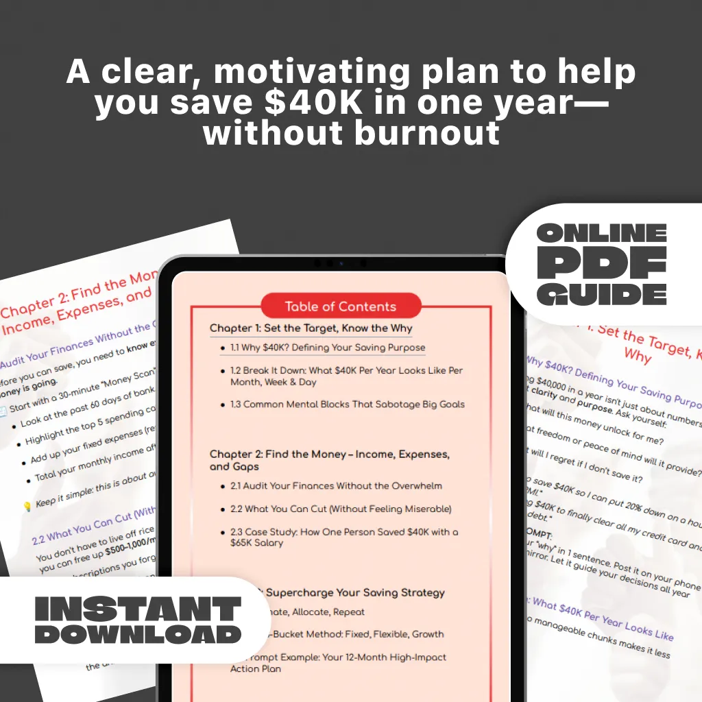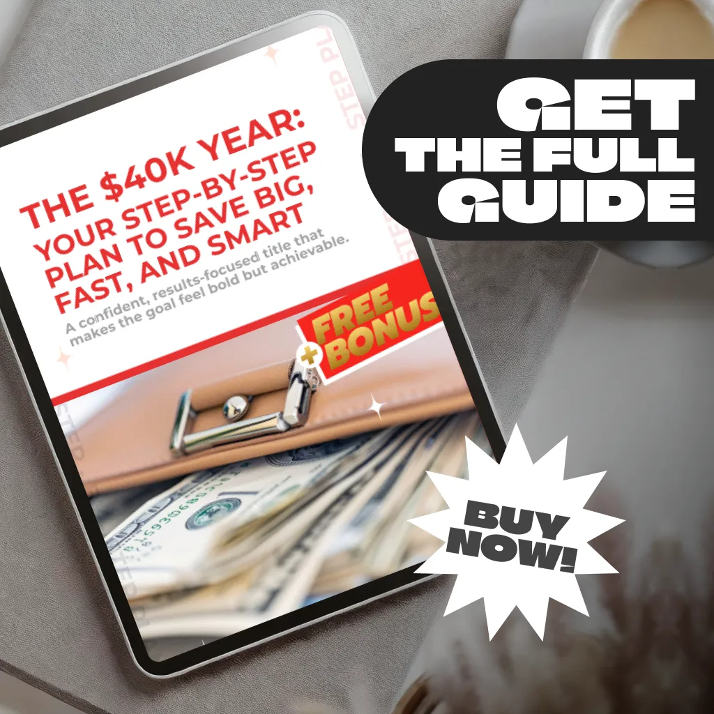 Why wait another year to get closer to your dream? Download The $40K Year: Your Step-by-Step Plan to Save Big, Fast, and Smart today and take control of your financial future. If you’ve been wondering how to save $40K in a year, the answer starts here.