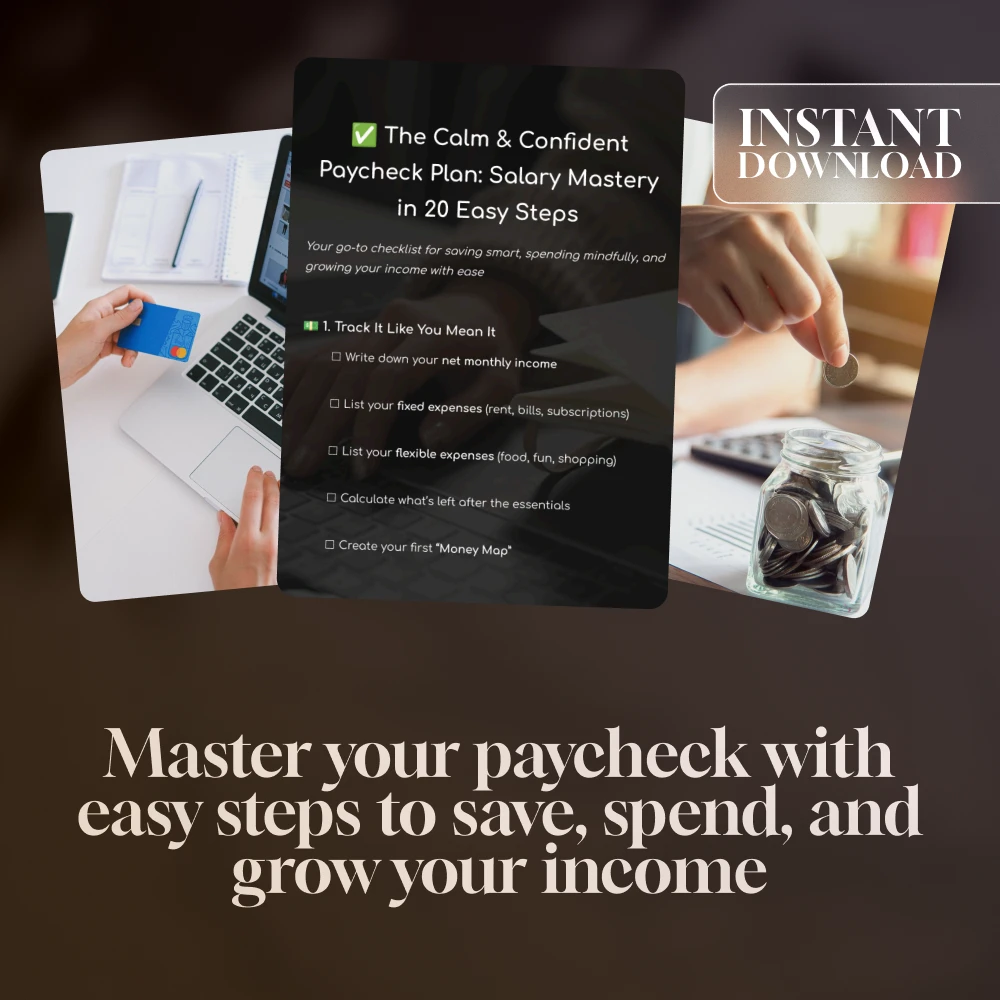 Ready to stop wondering where your money went every month? Say hello to clarity, control, and confidence with The Calm & Confident Paycheck Plan: Salary Mastery in 20 Easy Steps. This digital download is your go-to printable checklist to help you master your salary with small, practical steps—no financial background needed. Designed for real life, this easy-to-follow plan helps you understand how to manage your salary and save, all while staying calm, organized, and empowered.