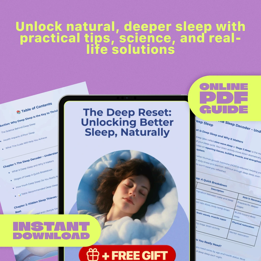 If you’ve been tossing and turning, waking up groggy, or just not feeling fully rested, it’s time for a change. The Deep Reset: Unlocking Better Sleep, Naturally is a practical, research-backed digital guide designed to help you achieve true deep sleep improvement—without relying on pills or gimmicks. Whether you’re struggling with a racing mind at night, poor sleep habits, or mysterious energy slumps, this guide gives you the tools to finally reset your sleep cycle and wake up refreshed.