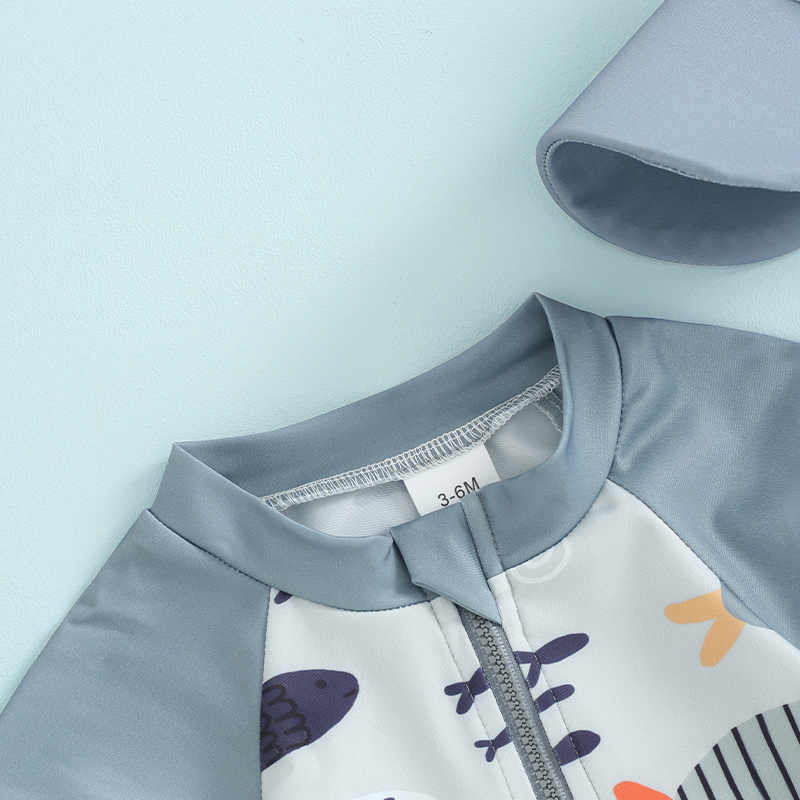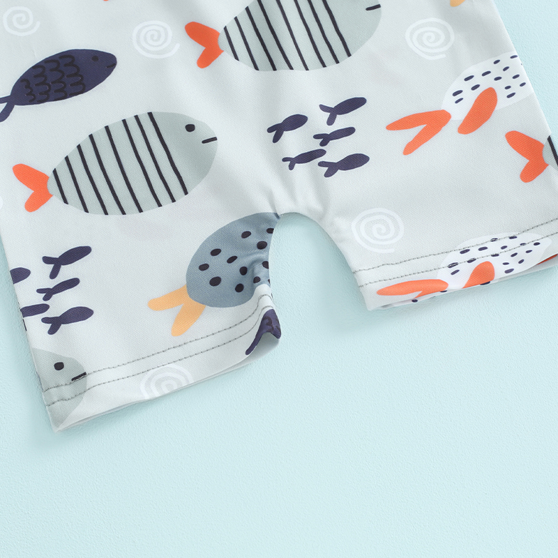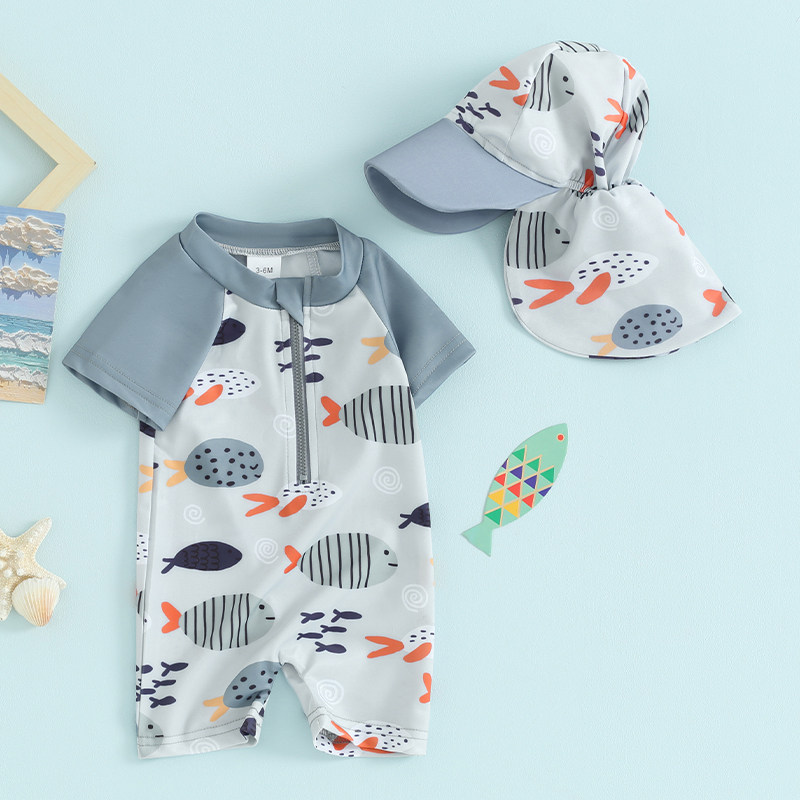 Get your little one ready for summer fun with this playful and practical toddler boys’ swimsuit set. Featuring a vibrant cartoon fish print and designed with comfort in mind, this short-sleeve rash guard swimsuit comes with a matching swimming hat to keep your child protected under the sun. The front zipper makes dressing quick and easy, even when wet — a true lifesaver for busy parents. Whether it’s their first beach trip or a day at the pool, this set is a must-have in your baby’s warm-weather wardrobe.