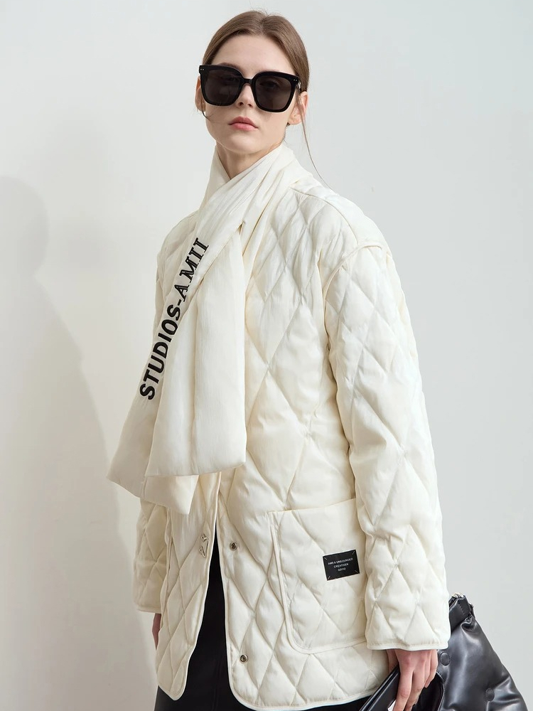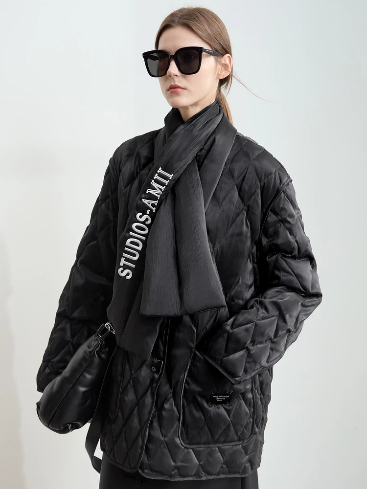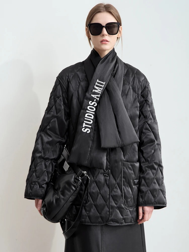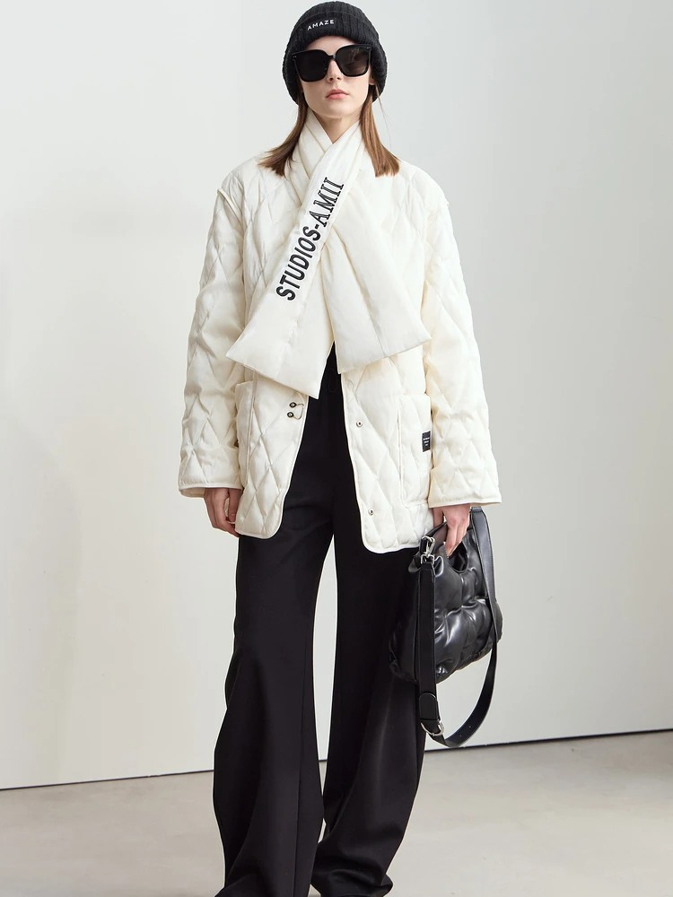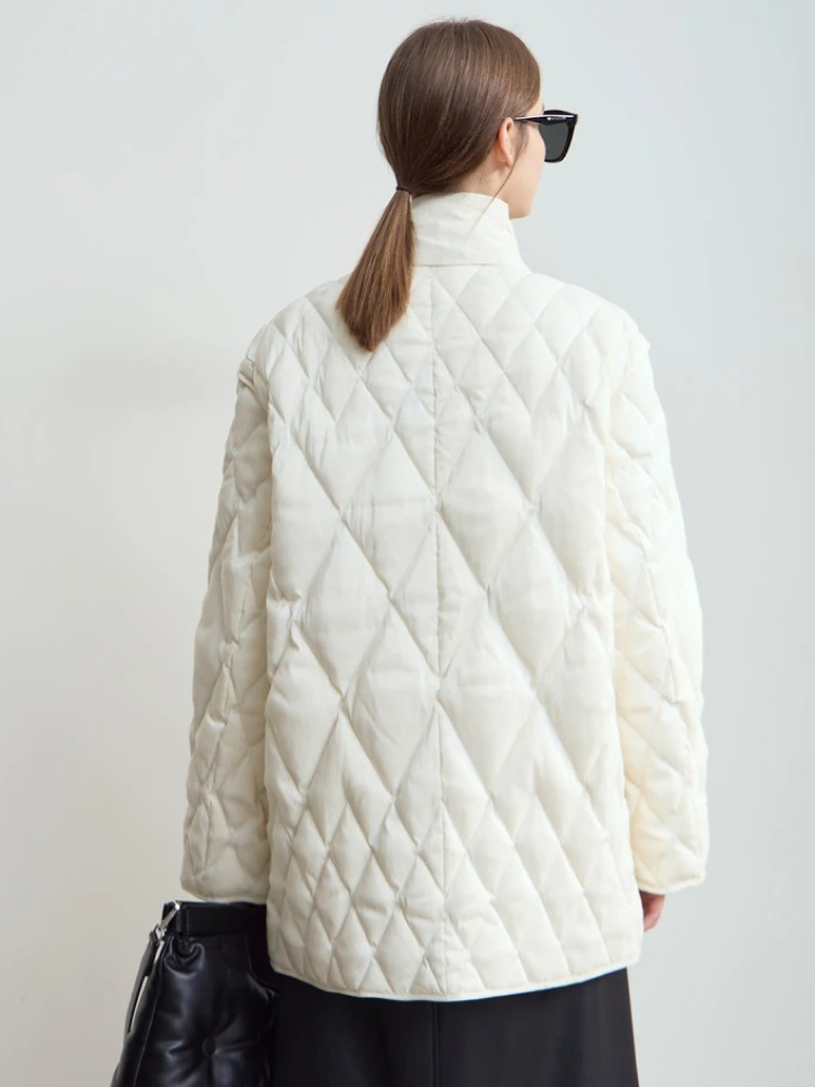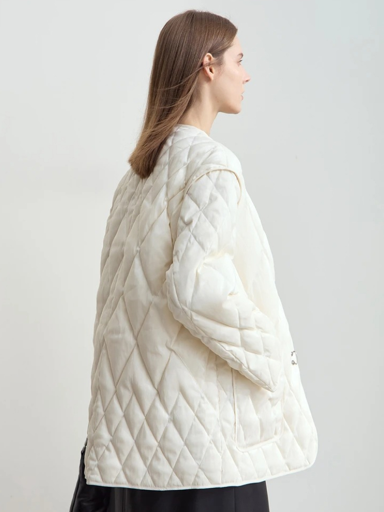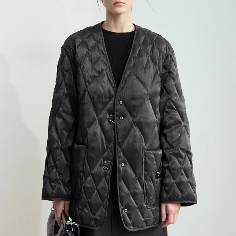 This down jacket isn’t just about staying warm – it’s about doing so in style. Its minimalist design and the subtle embroidered details give it an elevated look, perfect for any casual winter outing. The V-neckline adds a soft, feminine touch that pairs beautifully with your favorite scarves or turtlenecks, while the textured rhombus pattern adds a modern edge. Whether you’re dressing up for a day at the office or relaxing on the weekend, this jacket adapts to any occasion.