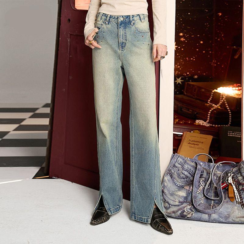 Elevate your fall wardrobe with these washed blue retro casual split straight jeans. These versatile jeans are designed to bring effortless style to your everyday look, combining timeless retro aesthetics with modern comfort. Whether you’re running errands, meeting friends, or lounging at home, these jeans provide the perfect blend of casual and chic, making them an all-season staple for your closet. With their unique color diamond split detailing, they add a dash of playful elegance to your look without compromising on comfort.