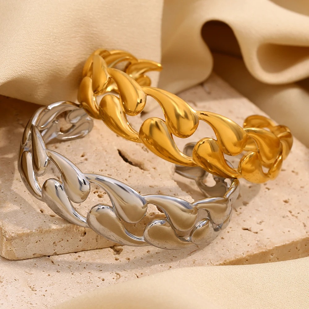 Introducing the Wide Face Hollow Water Droplet Bracelet, a stunning piece designed for the modern woman who loves to make a statement. Crafted from high-quality 316L stainless steel, this cuff bracelet features a unique water droplet-inspired design that is both bold and sophisticated. Its hollow pattern adds a touch of contemporary flair, making it the perfect accessory to complement any outfit. Whether you’re dressing up for a night out or adding a bit of edge to your daily look, this bracelet is the ideal choice.