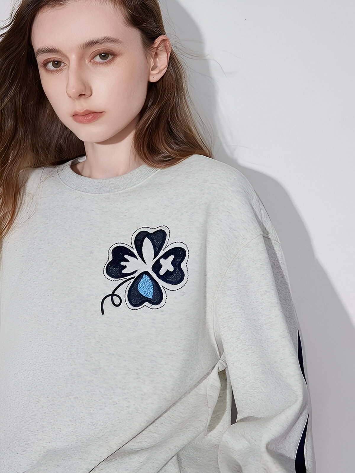 What sets this sweatshirt apart is its thoughtful design and quality craftsmanship. The embroidered clover detail adds a touch of whimsy and charm, while the thick fleece ensures lasting warmth. Its loose fit accommodates layering without compromising on style, and the drop sleeves lend it a contemporary edge. Plus, it’s free of harsh chemicals, so you can wear it with peace of mind.