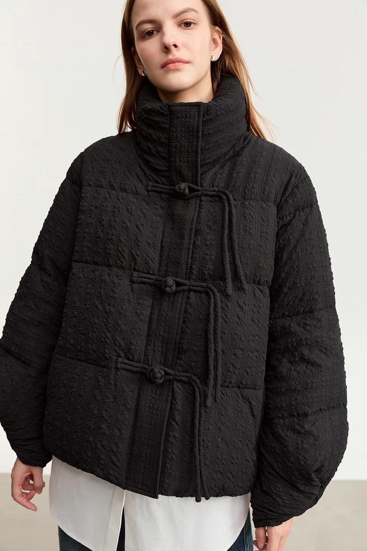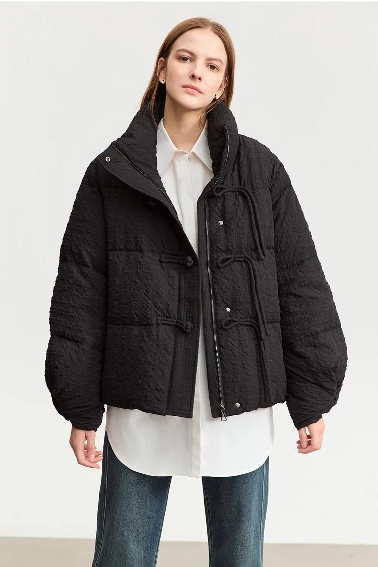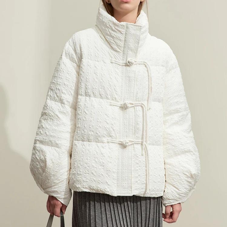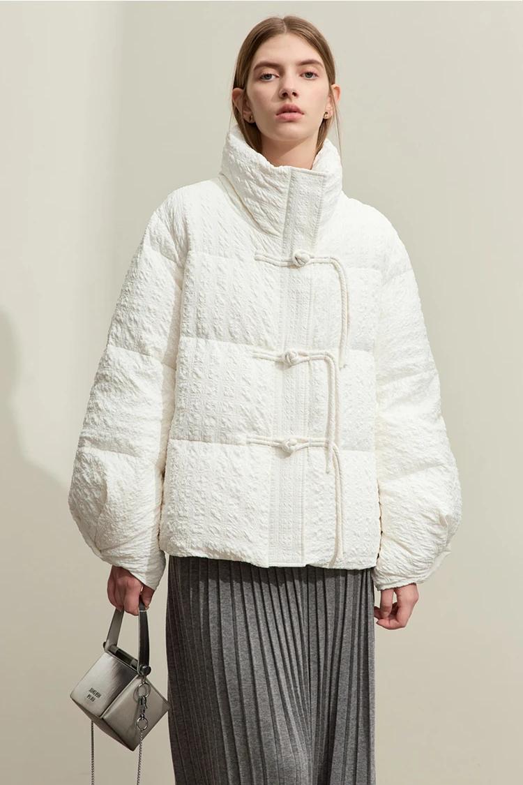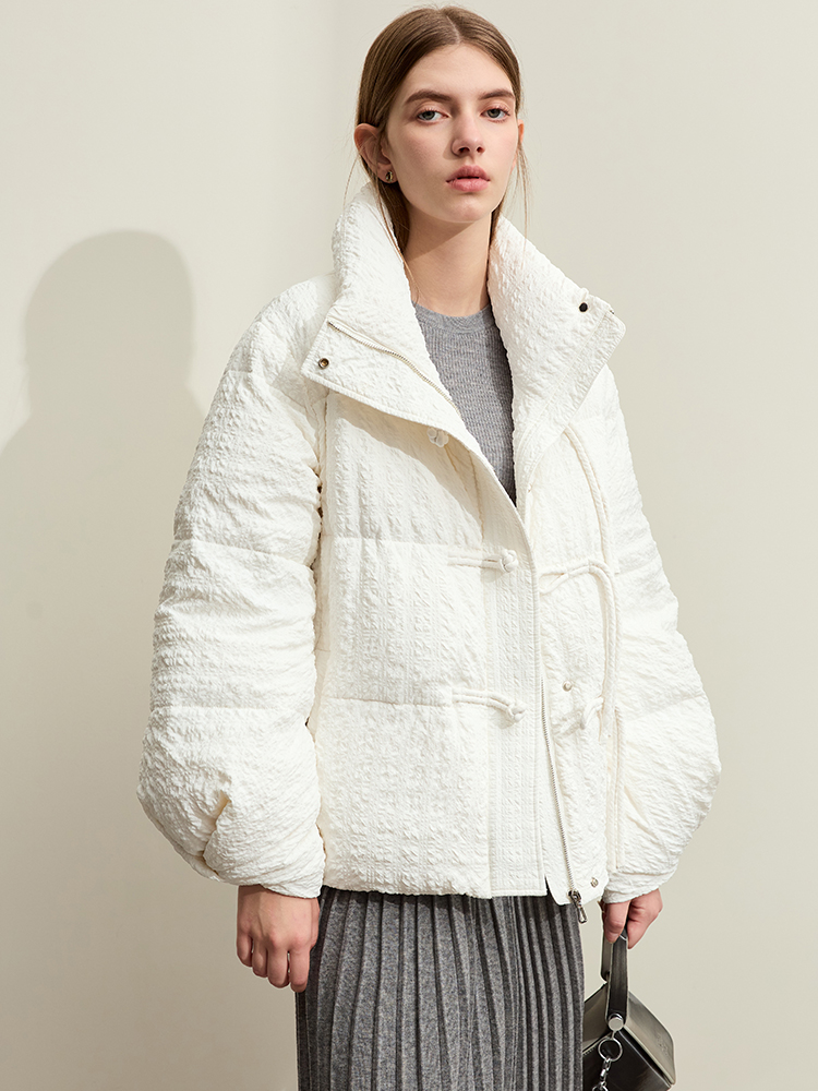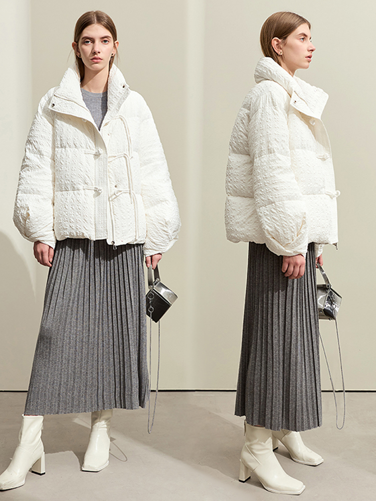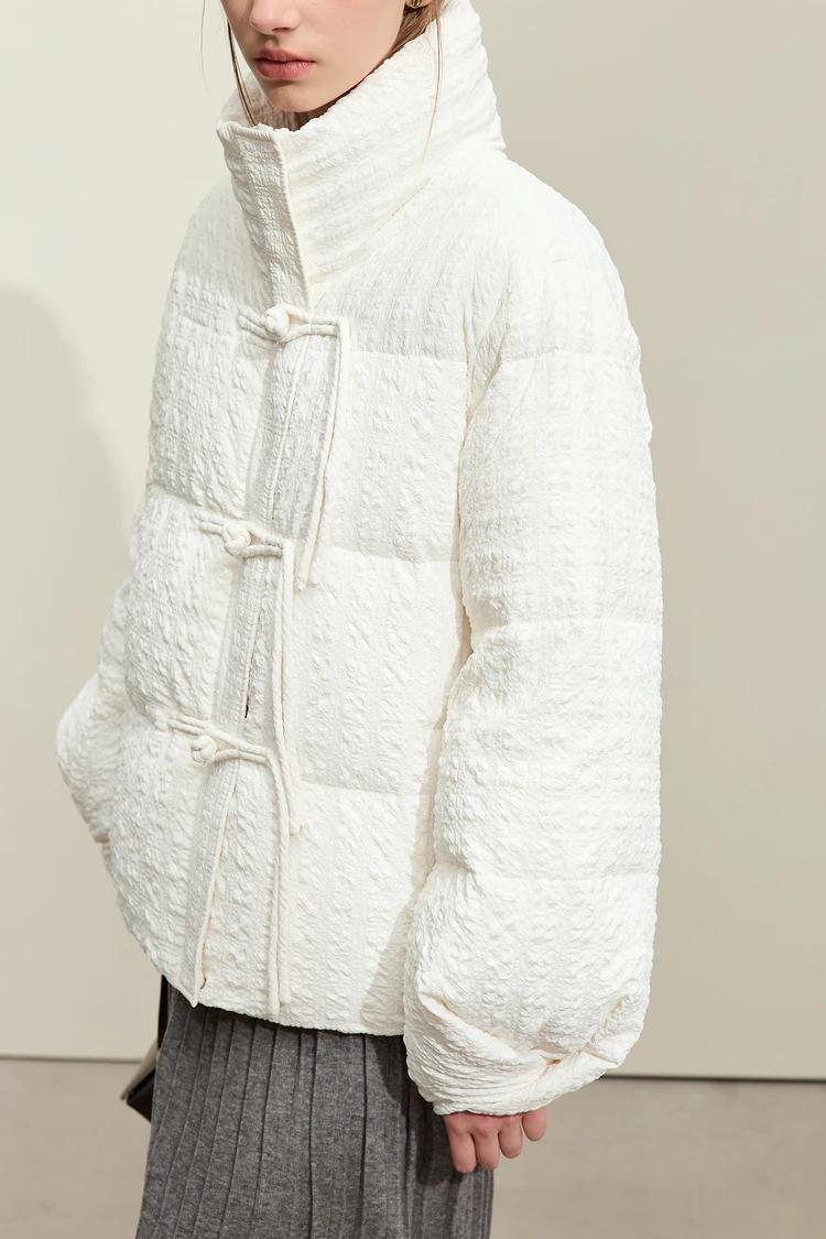 Step into the winter season with a down jacket designed to combine comfort, warmth, and modern streetwear style. This minimalist winter jacket features an elegant solid color, full-length sleeves, and an adjustable waist for a flattering fit. The unique folding cuff design with disc buckles adds a sophisticated touch, making it not only a practical piece for snowy days but also a stylish choice for urban wear. Filled with 85% white duck down, this jacket provides superior warmth while remaining lightweight and easy to wear. Stay cozy and chic, no matter the weather.