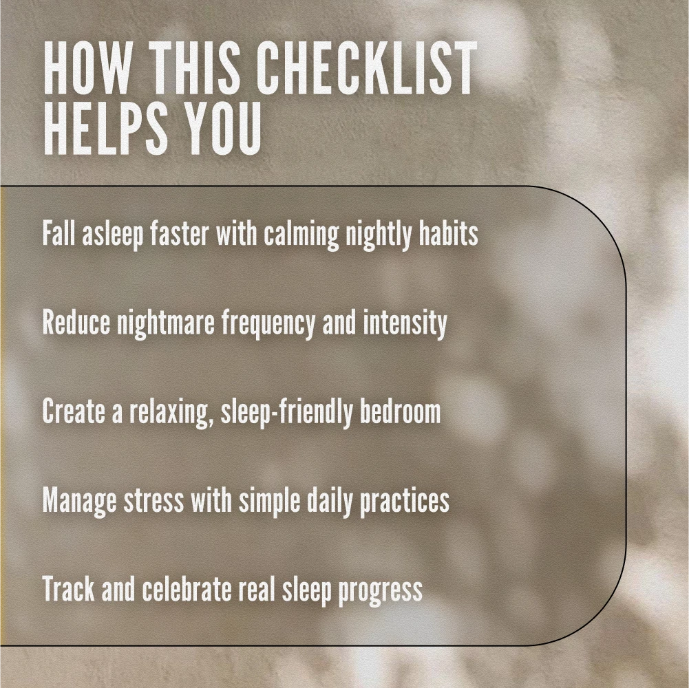 Unlike generic sleep tips or overwhelming eBooks, this checklist gives you bite-sized, specific actions—no guesswork. It’s not just about “sleep better”—it’s about tackling nightmares at their root. With a holistic blend of science, psychology, and self-care, you get a realistic game plan that grows with you.