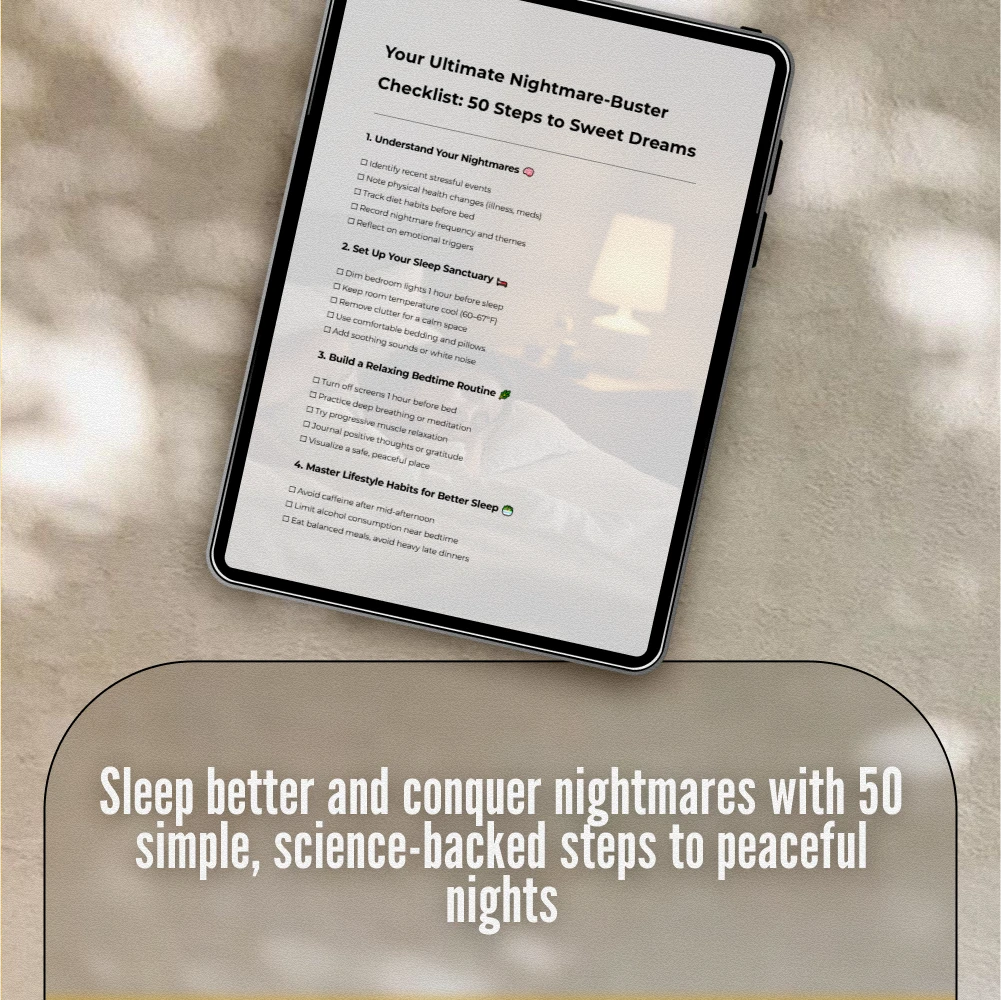 Don’t let nightmares control your nights or your days. Download Your Ultimate Nightmare-Buster Checklist: 50 Steps to Sweet Dreams now and take back your rest—one calm, peaceful night at a time.